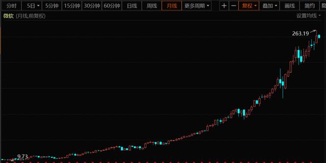 △近10年微软股价走势图(月线图)