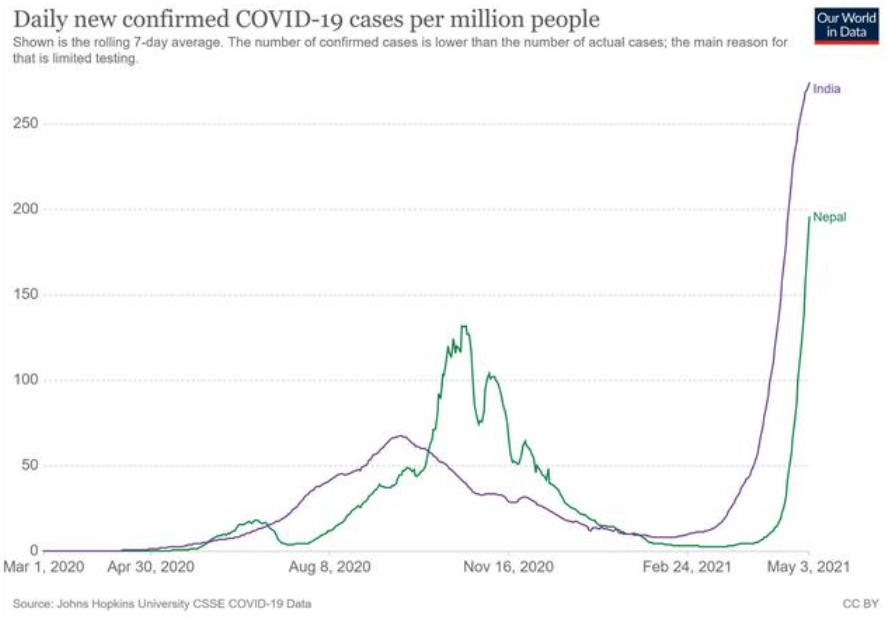 更糟糕的信号是,印度疫情正在向周边国家扩散。