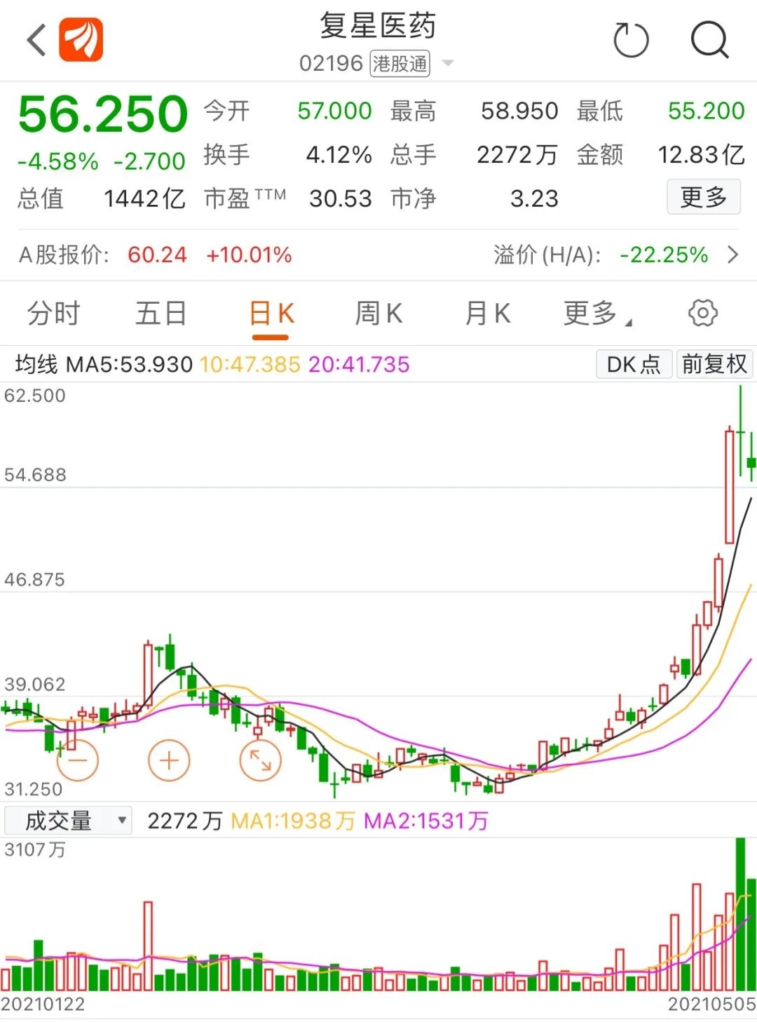作为辉瑞新冠疫苗的中国引进方,复星医药(02196.HK)股价表现非常强势。5月3日一度飙涨近20%,5月4日盘中一度刷新历史新高62.5港元。截至5日收盘,复星医药最新股价为56.25港元。4月以来,复星医药累计涨幅已接近70%,总市值达到1442亿元。