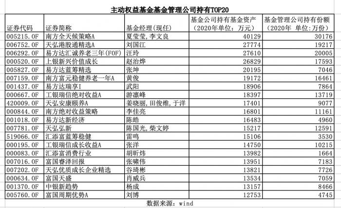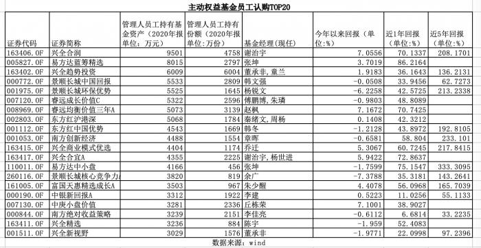 21世纪经济报道记者梳理了2020年年报中披露基金公司员工买入金额前20的权益基金,剔除了战略配售的养老目标基金。