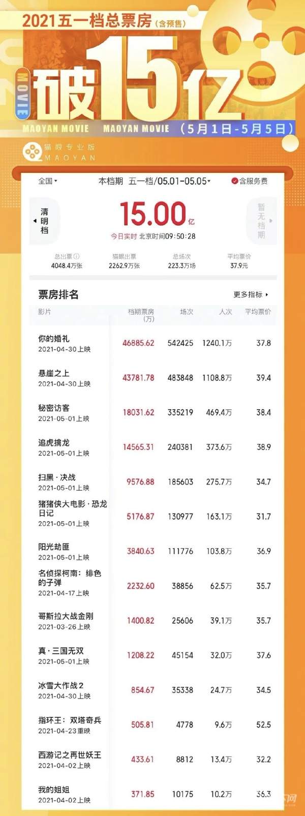 今年五一档,率先迈过4亿门槛的是改编自韩国同名电影的爱情片《你的婚礼》。这种领跑迹象在上映之前就已初显,《你的婚礼》在多个平台成为五一档期观众最想看的影片,并且大幅领先对手。它的成功也再度说明了类型片在中国日趋成熟,配合重要档期足以完成以小博大。走出影院的一位南京观众告诉记者,“刚刚看了电影《你的婚礼》,年轻时候的爱情故事也挺戳中人的心窝子的。期待很久了,比较喜欢男女主。”