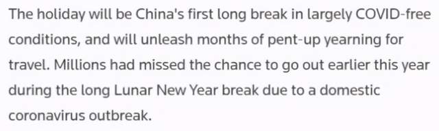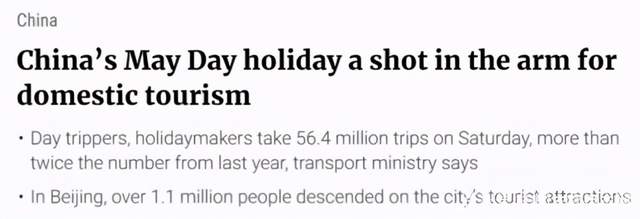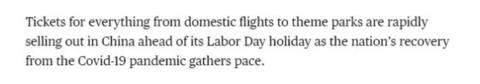 彭博社在报道的第一段就说:无论是国内航班的机票,还是游乐园的门票,在五一到来之前,所有的票都快速售罄,这显示出中国在后疫情时代的复苏逐渐提速。