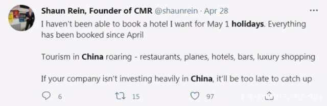 长期居住在中国的博主肖恩·赖恩说,自己没能预订到五一期间心仪酒店的房间,因为在4月就已经销售一空。