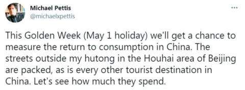 居住在北京后海附近的经济学者迈克尔·佩蒂斯说:“五一黄金周,我们将有机会测量中国消费水平恢复程度。我家附近的胡同已经人满为患,就像全中国任何一个旅游景点一样。让我们看看他们究竟会花多少钱。”