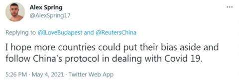 网友Alex Spring说,我希望更多国家放下偏见,参考中国的抗疫模式。