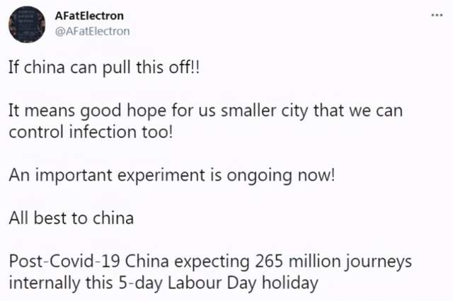 网友AFatElectron说:“如果中国能做到!这说明我们小城市控制疫情也有希望!”