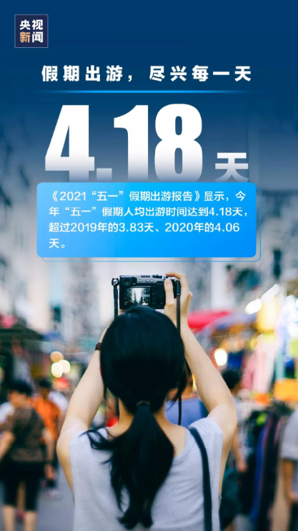 “五一”连休5天,游客积蓄已久的长途出行需求得以释放。去哪儿发布的数据显示,今年“五一”假期,游客人均出游时间达到4.18天,超过2019年的3.83天、2020年的4.06天,人均1713元的花销也创近年“五一”假期新高。