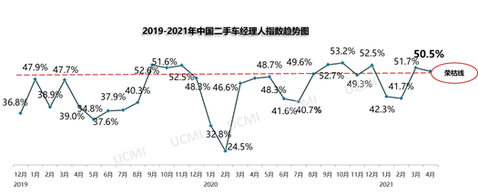 2021年5月6日,中国汽车流通协会发布最新一期“中国二手车经理人指数”(UCMI)。本期UCMI结果显示,4月份二手车经理人指数为50.5%,处于荣枯线以上,二手车市场处在景气区间。