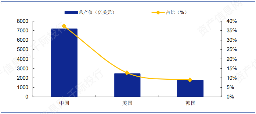 2019年7月30日,KEA发布《全球电子产业主要国家生产动向分析报告》,从绝对产值看,中国、美国和韩国位列全球前三,电子产业总产值依次为7172.66亿美元、2429.45亿美元和1696.76亿美元,全球占比分别为37.2%、12.6%和8.8%。其中,韩国凭借电子零部件(内存半导体)的繁荣,超越日本挤入全球前三。从相对增速看,越南、印度和韩国位列前三,年平均增速依次为11/7%、10.9%和9%。″与5年前相比,中国电子产业总产值增长了2.9%,美国增长了1%,日本减少了2.3%,而韩国则增长了53.3%。。