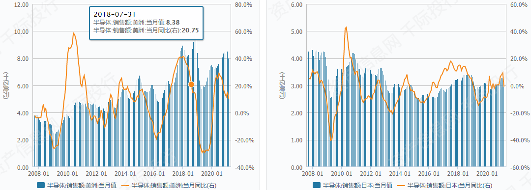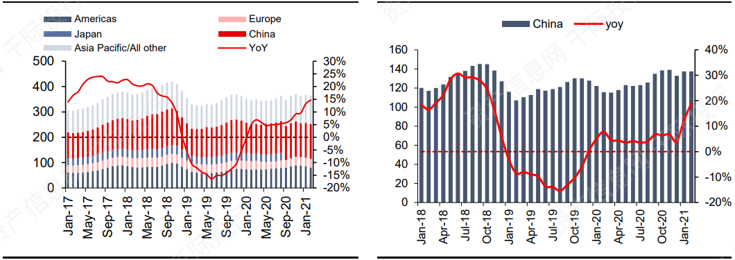 2021年1月全球半导体行业销售额同比增速高达13.2%。全球半导体产业自2019年下半年以来探底回升,2020年虽受新冠疫情冲击,但仍表现出较强韧性,且2020年下半年随着疫情受控,行业景气度持续高涨。从销售端高频数据看,2021年2月份全球半导体销售额395.88亿美元,同比增速达14.66%。其中中国市场137.35亿美元,同比增长18.91%。
