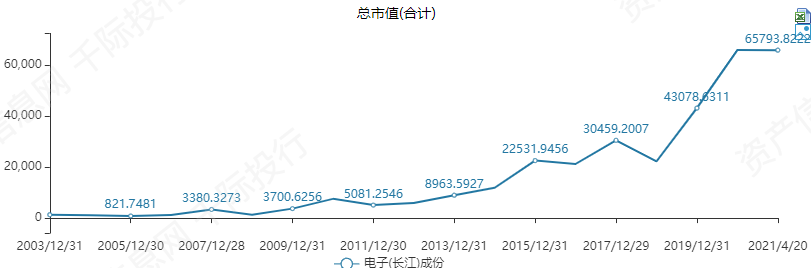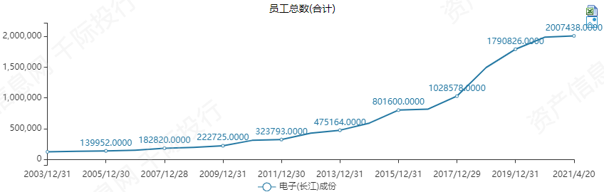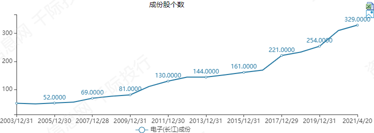 截止2021年4月20日,电子(长江)成份沪深成分股个数为329,在近几年中呈上升趋势。企业总市值持续上涨,截止2021年4月15日,企业总市值为65793.8222亿元,企业员工总数达2007438人。