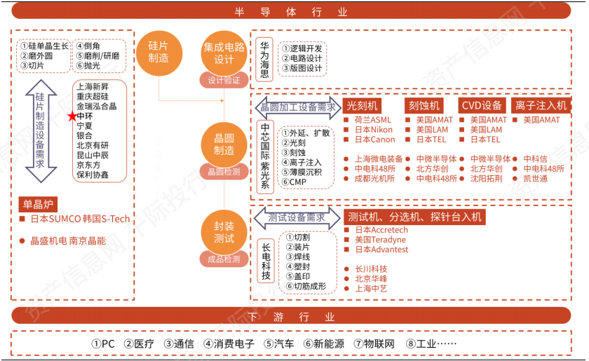 半导体行业的上游为半导体支撑业,包括半导体材料和半导体设备。中游按照制造技术分为分立器件和集成电路。下游为消费电子,计算机相关产品等终端设备。半导体行业除了受行业供需变化周期性影响外,还受到新产品周期的影响。