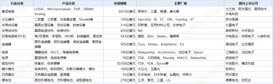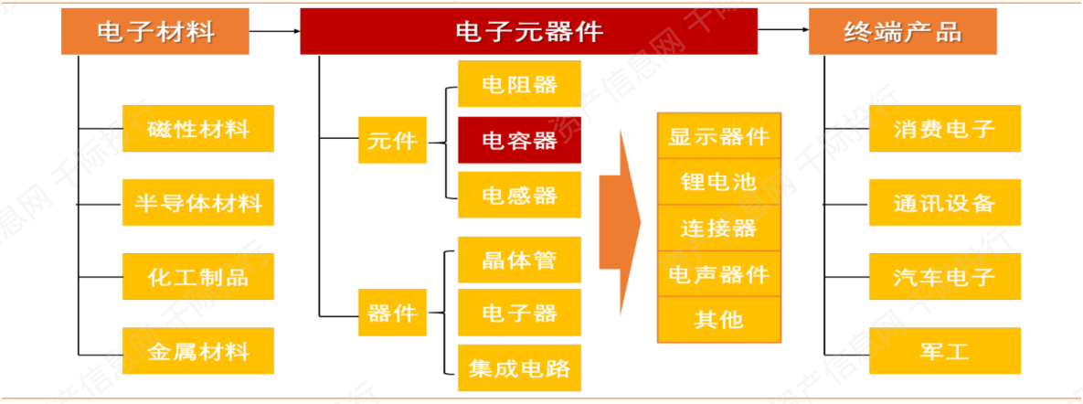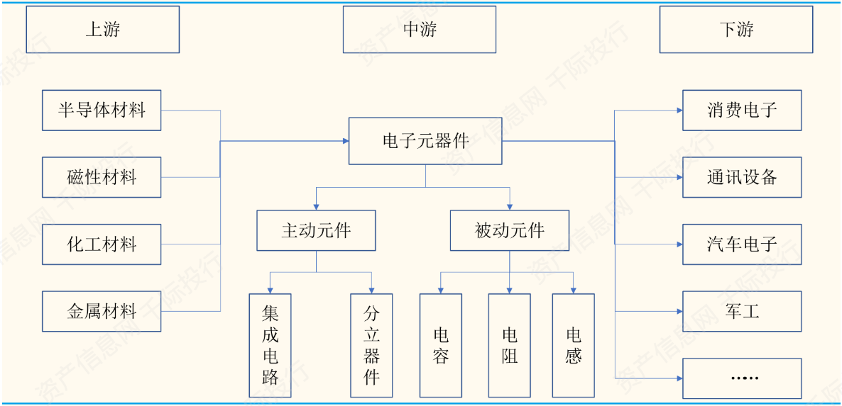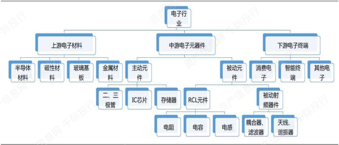 电子元器件行业位于产业链的中游,下游是各种消费电子、通讯设备等终端产品,上游则是各种电子材料。按照工作是否需要外部能量源,电子元器件可以分为主动元件和被动元件两大类。其中被动元件包括电容、电阻和电感;主动元件包括分立器件和集成电路。