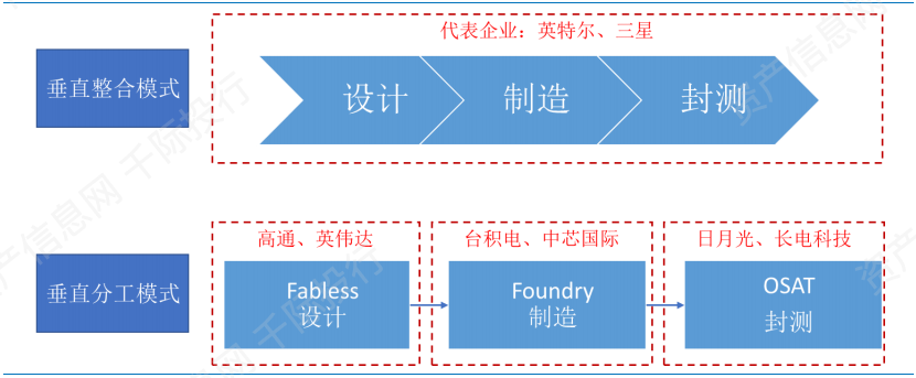 半导体企业的经营模式可分为垂直整合和垂直分工两大类。采用垂直整合模式(Integrated Device Manufacturer,IDM)的企业可以独立完成芯片设计、晶圆制造、封装和测试等生产环节, 代表企业包括英特尔、三星等。垂直分工模式为Fabless设计+Foundry制造+OSAT封测。Fabless 芯片设计公司采用无晶圆厂模式,只负责研发设计和销售,将晶圆制造、封装、测试外包出去, 代表企业包括高通、英伟达等。