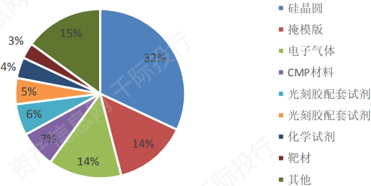 根据半导体芯片制造过程,一般可以将半导体材料分为基体、制造、封装三大类:其中基体材料包括硅晶圆、硅基材以及化合物半导体;制造材料包括光刻胶、抛光材料、掩模版、特种气体等﹔封装材料包括键合丝、陶瓷封装材料、芯片粘结材料等。其中硅晶圆、掩模版、电子气体占据市场份额较大。