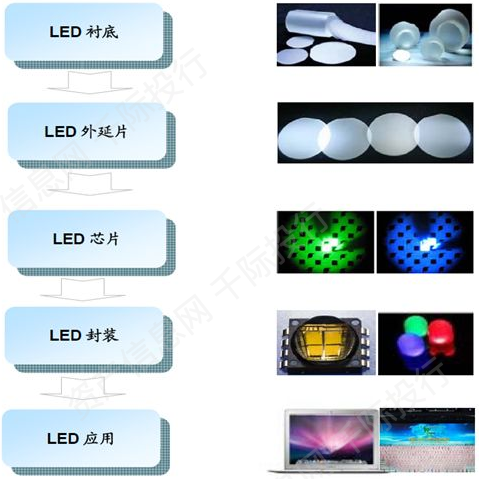 LED主要分为LED衬底、LED外延片、LED芯片、LED封装和LED应用五个阶段。其中LED衬底、LED外延片和LED芯片统称为上游,LED封装为中游,LED应用为下游。