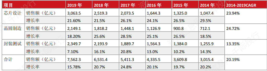 集成电路制造三大工序中,技术门槛从高到低依次为制造/设备>设计>封测,我国晶圆制造和芯片设计行业销售额增长较快。