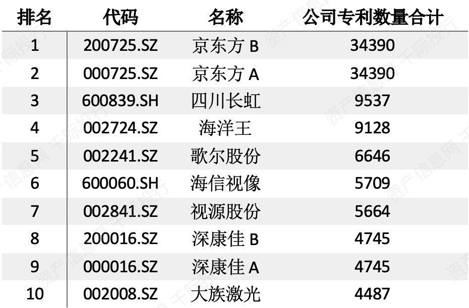 对国内电子行业的各个专利申请人的专利数量进行统计,排名前十的电子公司依次为:京东方B、京东方A、四川长虹、海洋王、歌尔股份、海信视像、视源股份、深康佳B、深康佳A、大族激光等。
