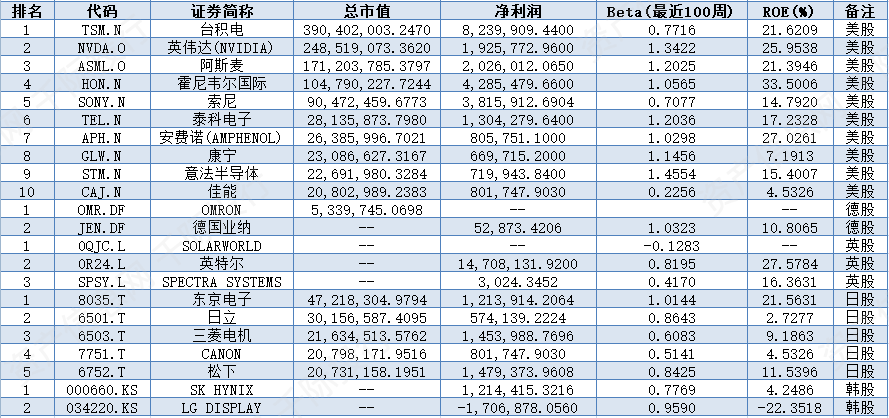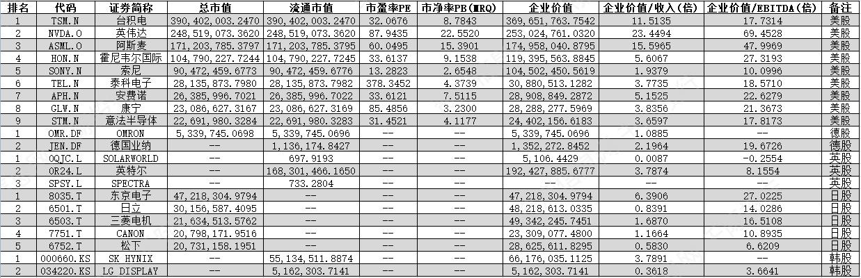 全球非中国主要企业有台积电[TSM.N]、英伟达(NVIDIA)[NVDA.O]、阿斯麦[ASML.O]、中国主要企业有泰科电子[TEL.N]、安费诺(AMPHENOL)[APH.N]、康宁[GLW.N]、意法半导体[STM.N]、佳能[CAJ.N]、OMRON[OMR.DF]、德国业纳[JEN.DF]、SOLARWORLD[0QJC.L]、英特尔[0R24.L]、SPECTRA SYSTEMS[SPSY.L]、东京电子[8035.T]、日立[6501.T]、三菱电机[6503.T]、CANON[7751.T]、松下[6752.T]、SK HYNIX[000660.KS]、LG DISPLAY[034220.KS]等。