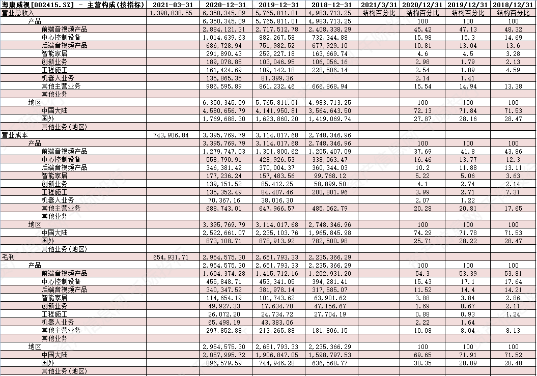 (2) 海康威视[002415.SZ]是领先的视频产品和内容服务提供商,面向全球提供领先的视频产品、专业的行业解决方案与内容服务。公司积极布局新兴市场和新兴业务,基于互联网推出了面向家庭和小微企业的相关产品及云服务平台;进入智能制造领域,推出了一系列机器视觉产品及解决方案。公司产品已涵盖视频监控系统的所有主要设备,包括前端采集设备、后端存储及集中控制、显示、管理及储存设备。典型视频监控系统的前端设备主要包括摄像机(采集视音频信号)及DVS(压缩及编码视音频信号);典型视频监控系统的后端设备主要包括录像机(记录及存储视音频信号);典型视频监控系统的中心控制设备主要包括集中控制设备(控制、检索及显示视音频信号)、VMS软件及中心储存设备。此外,公司拥有门禁、报警、可视对讲等系列大安防领域的产品。