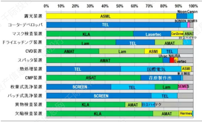 全球半导体设备市场集中度较高,主要核心设备领域由欧、美、日厂商主导。2019年全球半导体设备厂商CR5达到78% ,CR10达到92%。光刻设备、显影设备、清洗设备、异物检查设备、缺陷检查设备几乎为“一超多强”的模式;光掩膜检查设备、CVD设备、热处理设备、CMP设备、单片式清洗设备为“二超多强”的模式;干蚀设备几乎为“三超一强”的模式。