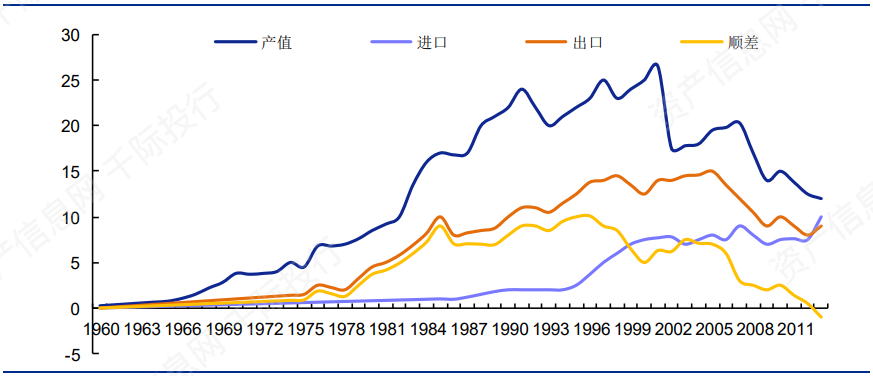 图 日本电子产业的产值、进出口额、顺差(万亿日元)