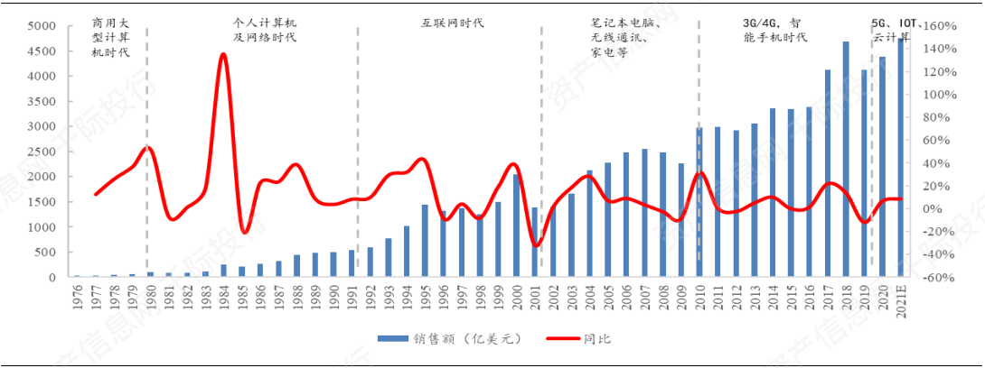 半导体行业指以半导体为基础而发展起来的一个产业。上游为半导体支撑业,包括半导体材料和半导体设备。中游按照制造技术分为分立器件和集成电路。半导体具有周期性,半导体行业受行业本身供需以及新产品周期的影响。历次的金融危机和泡沫破裂都会使得半导体行业在短期内下降,但是从长期来看,新产品的推出才是半导体行业持续发展繁荣的内在动力。
