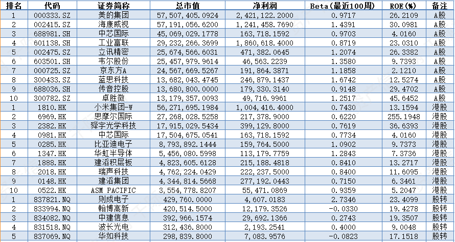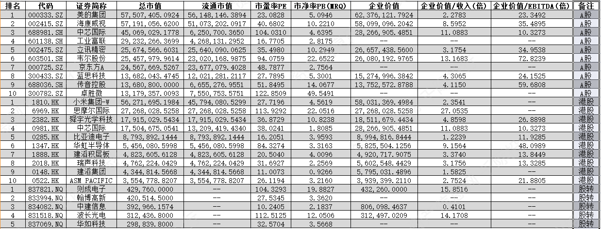中国主要企业有美的集团[000333.SZ]、海康威视[002415.SZ]、中芯国际[688981.SH]、工业富联[601138.SH]、立讯精密[002475.SZ]、韦尔股份[603501.SH]、京东方A[000725.SZ]、蓝思科技[300433.SZ]、传音控股[688036.SH]、卓胜微[300782.SZ]、小米集团-W[1810.HK]、思摩尔国际[6969.HK]、舜宇光学科技[2382.HK]、中芯国际[0981.HK]、比亚迪电子[0285.HK]、华虹半导体[1347.HK]、建滔积层板[1888.HK]、瑞声科技[2018.HK]、建滔集团[0148.HK]、ASM PACIFIC[0522.HK]、中建信息[834082.NQ]、波长光电[831518.NQ]、华如科技[837069.NQ]等。