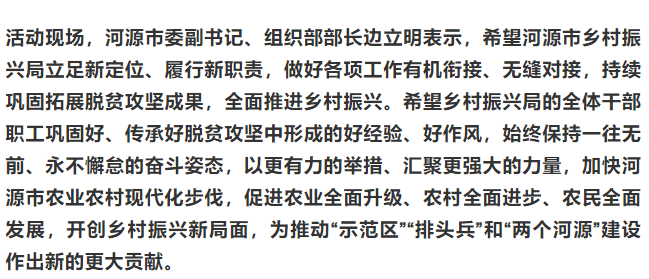 河源市乡村振兴局揭牌,标志着河源市进入全面推进乡村振兴的新阶段。据介绍,河源市乡村振兴局成立后,将承担乡村振兴统筹协调、政策指导、推动落实、督促检查等职能,负责巩固拓展脱贫攻坚成果,牵头抓好乡村建设,协调做好乡村治理,并与市直相关单位紧密配合,全面推进乡村振兴。