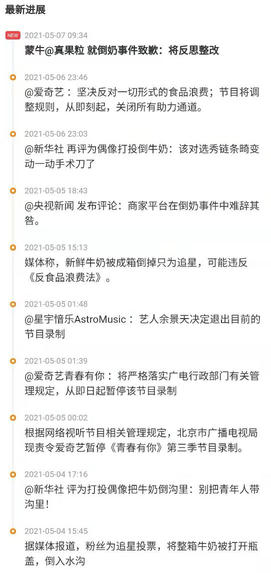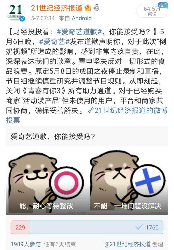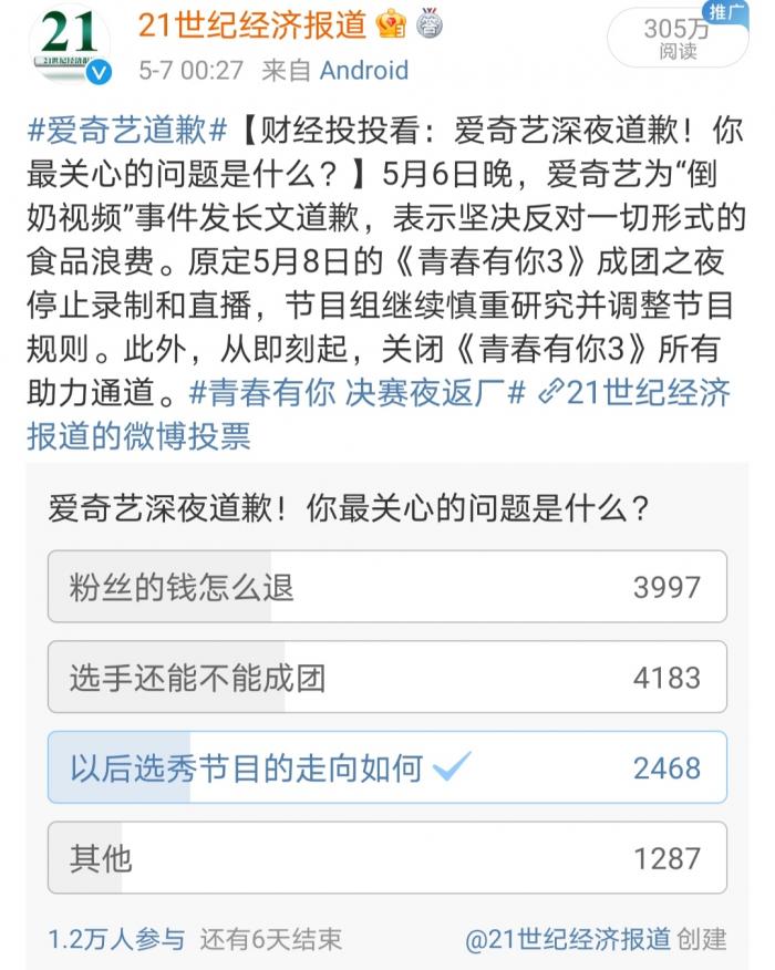 就在前一天(5月6日)深夜,爱奇艺发长文为倒奶事件道歉,也表示坚决反对一切形式的食品浪费。原定5月8日的《青春有你3》成团之夜停止录制和直播,节目组继续慎重研究并调整节目规则。从即刻起,关闭《青春有你3》所有助力通道。