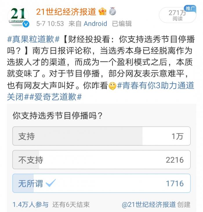 爱奇艺、蒙牛道歉,近9成投票网友不接受!超7成支持停播选秀节目