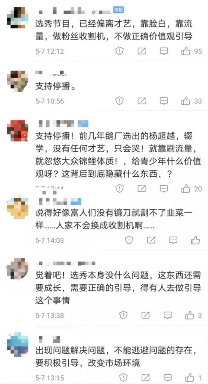 支持的网友认为,如今的选秀节目已经偏离才艺,不做正确价值观引导,只在乎短暂的流量效应;不支持者则认为,选秀本身没什么问题,需要给出积极引导。
