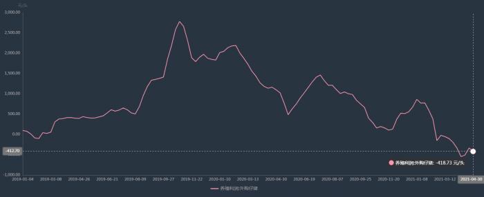 进入3月后,亏损幅度小幅收窄至100元以内,但是4月开始迅速扩大,4月9日和4月16日当周头均亏损幅度已超过500元,至4月末仍然维持在419元左右。