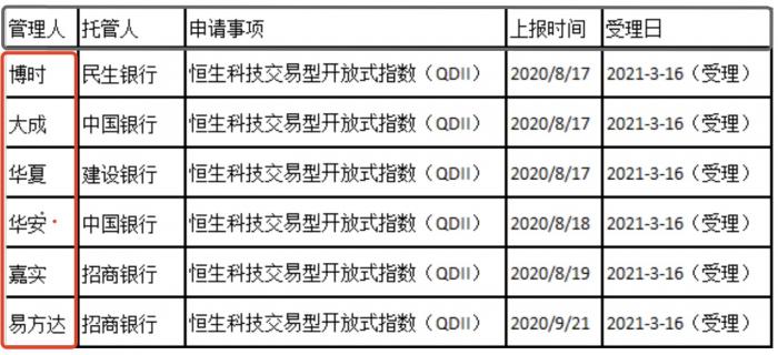 5月6日传出消息,包括易方达、华夏、博时、嘉实、大成、华安等6家基金公司旗下恒生科技ETF产品拿到批文。