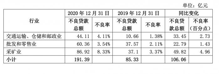 对公不良贷款额出现增长主要集中在交通运输、仓储和邮政业,批发和零售业,采矿业行业。这三个行业的不良贷款合计增加106.06亿元,占全部对公不良贷款增量的103%。其中,采矿业2020年末的不良率为8.33%,较上年末上升了4.96个百分点。