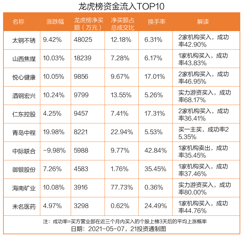 5月7日,上证指数下跌0.65%,深证成指下跌1.95%,创业板指下跌3.46%。盘后龙虎榜数据显示,共有66只个股因当日异动登上龙虎榜,资金净流入最多的是太钢不锈(000825.SZ),达4.8亿元。
