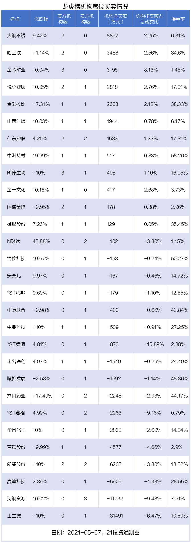据21投资通(微信号ID:touzit21)智能监测,29只个股龙虎榜出现了机构的身影,北向资金参与龙虎榜中的个股共涉及8只。
