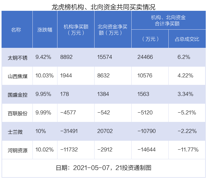 值得注意的是,机构和北向资金共同净买入了太钢不锈、山西焦煤、国盛金控等3股;共同净卖出了百联股份、河钢资源等2股;在士兰微上出现分歧,机构净卖出士兰微3.15亿元,北向资金净买入2.07亿元。