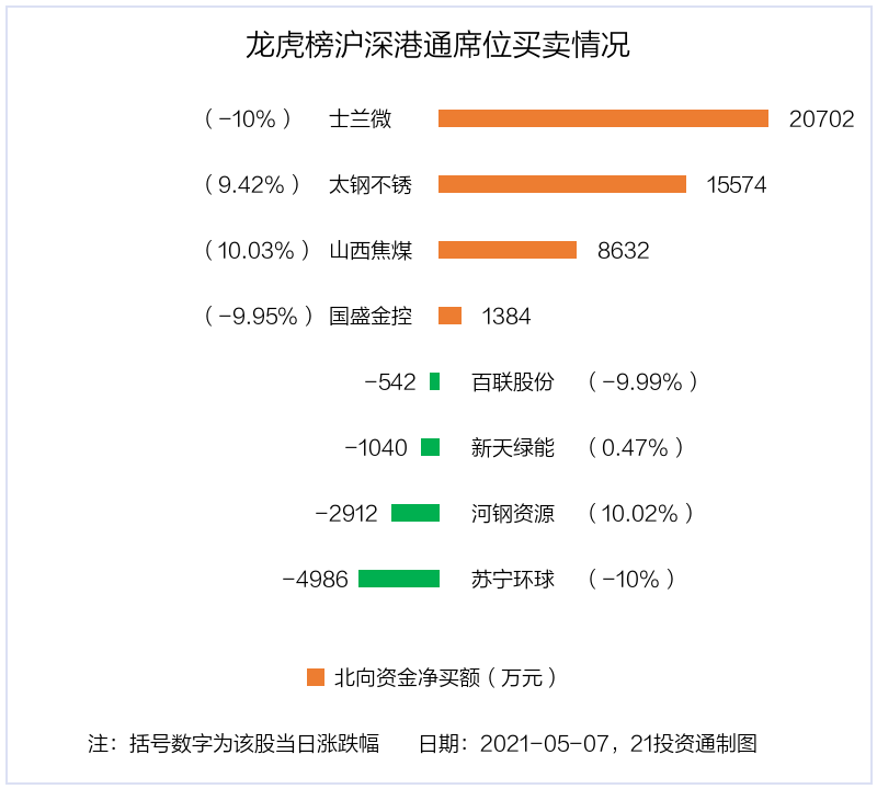 北向资金净买入金额最多的是士兰微(600460.SH),净买入2.07亿元,占总成交金额的4.26%。净卖出金额最多的是苏宁环球(000718.SZ),为4985.66万元,占总成交金额的4.2%,当日收盘下跌10%,换手率为7.96%。