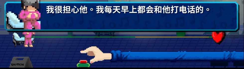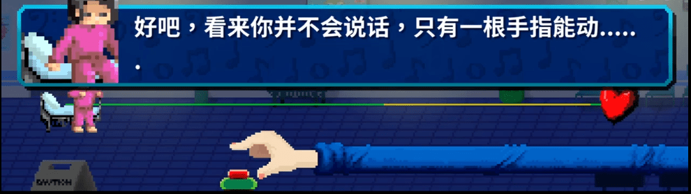相比起其他加入剧情和故事的音乐游戏,《节奏医生》最特殊的一点就是各元素的融合。它动用了一切能和音乐合作的元素来进行协调,是音乐、画面、演出、文字一起在给玩家讲故事,而玩家通过除颤设定,也切身地以一己之力推动着这个故事的发展。