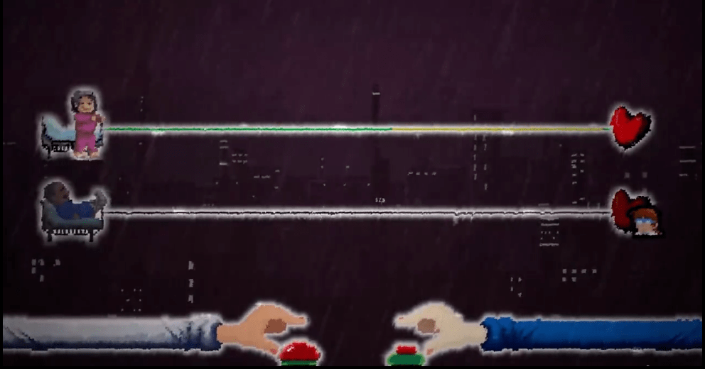 在没有歌词的游戏3-3“分离二重唱”关卡里,出现了一对年迈的夫妻,他们都住在这个医院,但并没有在同一个病房。丈夫腿脚受伤躺在了床上,医生正在为他治疗,而玩家则在为妻子治疗。