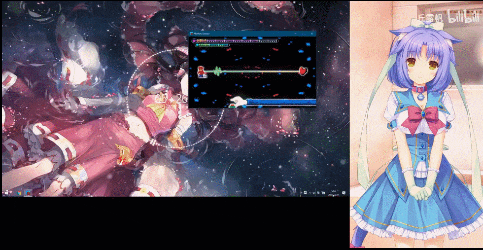 而游戏仅有的几首有歌词关卡的声画剧情表现,则更是一绝。给大量玩家留下极深印象的2-X“All The Time”讲述了医院里咖啡成瘾的男青年音乐创作者和抽烟成瘾的女咖啡师之间相互奔赴的故事,歌词将两者之间从暧昧情愫到坚定奔赴的过程描述了出来。声画表现上创新地使用了窗口移动踩点、场景转换奔赴来展现故事内容。