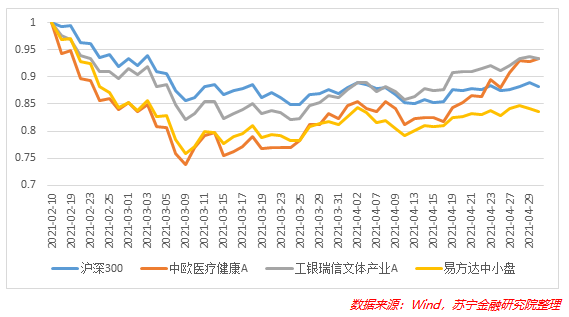 以2021年2月10日为基准,笔者选取了张坤的易方达中小盘、袁芳的工银瑞信文体产业A及葛兰的中欧医疗健康A进行分析。