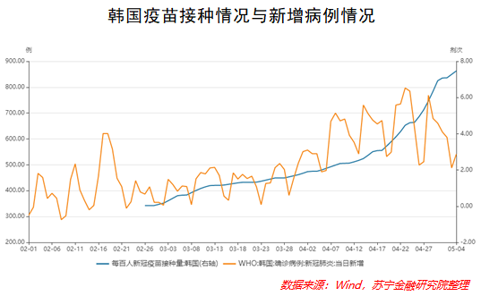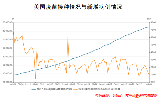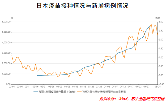 从美、日、韩三国的疫苗接种与新增病例情况来看,日韩两国当前每百人新冠疫苗接种量较低,自今年2月开始普及疫苗以来,当日新增病例与疫苗接种量同增长。美国疫苗普及率相对较高,每百人接种量接近75剂次,当日新增病例也在震荡下跌的趋势中。但值得注意的是,美国当日新增病例依然超过3万,疫苗的有效性在短期内无法得到验证。