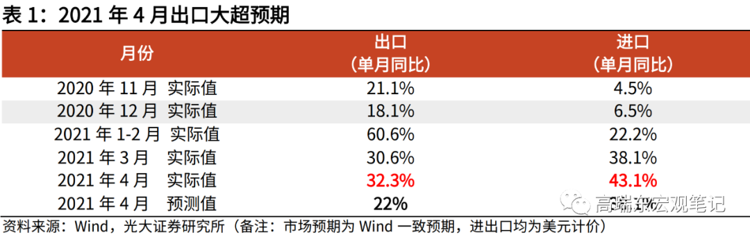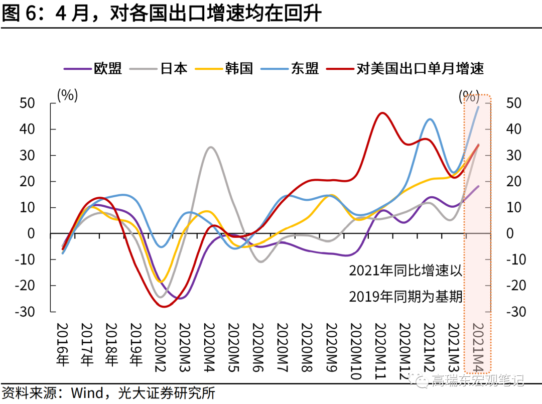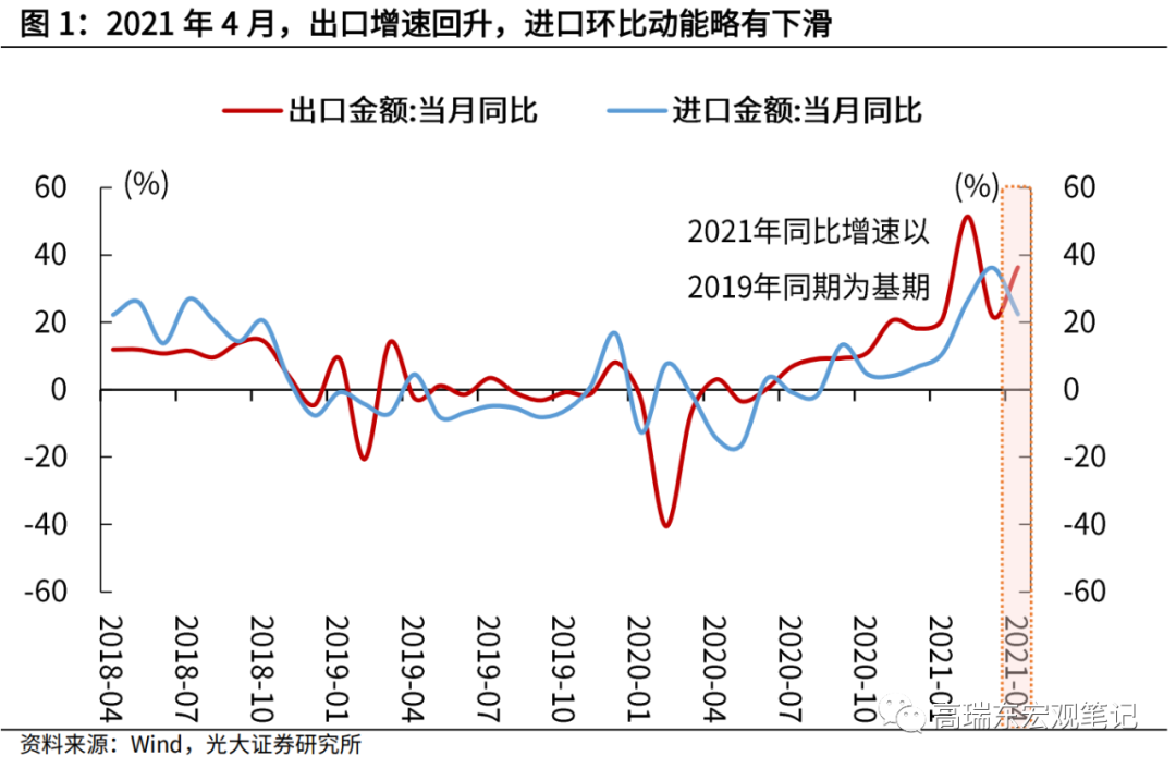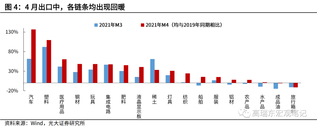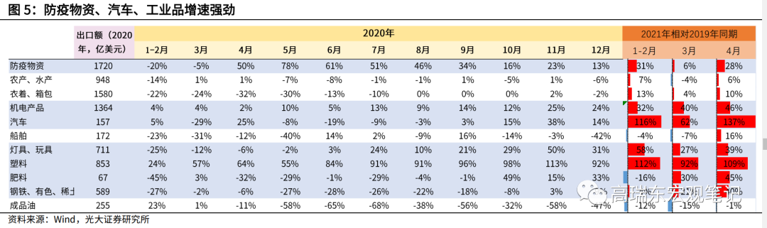 出口大幅反弹,超市场预期。4月出口同比增速32.3%,大超预期的22%。为剔除去年基数影响,与2019年同期相比,4月出口增长36%,比3月提高了14个百分点,大幅反弹。