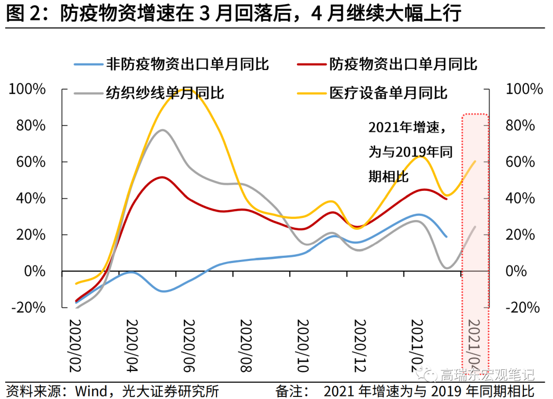 防疫物资增速在3月回落后,4月继续大幅上行。与2019年同期相比,纺织纱线用品出口增速从3月的2%回升至4月的24%,大幅上升了22个百分点。医疗器械出口增速从3月的42%回升至4月的60%。防疫物资大概占整体出口的15%左右,是拉动4月出口上行的主要力量之一。