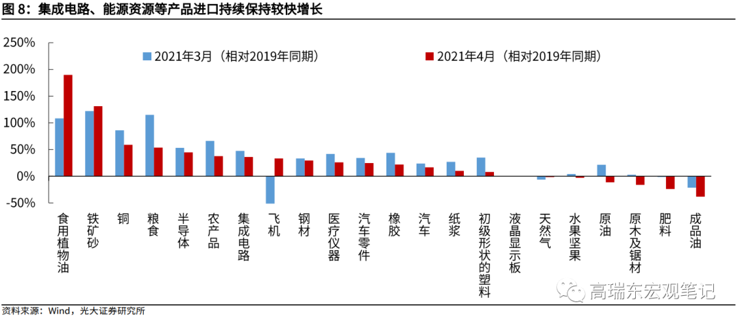 4月进口同比增速受去年低基数影响,大幅抬升,环比动能略有回落。4月进口同比增速43.1%,相对3月大幅抬升,主要是因为2020年4月进口大幅转负。与2019年同期相比,4月进口增长22%,比3月回落了14个百分点。进口边际回落,与4月份PMI制造业环比放缓的数据表现是一致的。不过,进口依然处于历史较高水平,我国制造业的景气度不断回升,补库存进程开启,也拉动集成电路、能源资源等产品进口持续保持较快增长。