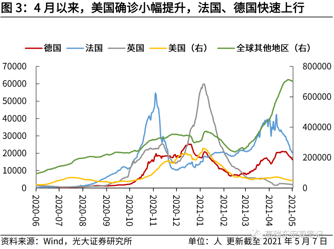 全球疫情持续反复,美国疫情小幅回升,法国、德国新增确诊人数快速上行,防疫物资出口依然会随着全球疫情波动。防疫物资[1]主要向欧美出口,占比约为41%(2020年累计),向东南亚、日韩出口占比约为 23%,向印度、巴西出口约为3%。4月以来,法国、德国新增确诊人数快速上行,美国疫情也有所回升。向前看,全球疫苗接种进度的不平衡,会导致疫情持续存在波动和反复的风险,防疫物资出口,依然会随着全球疫情的发展而波动。