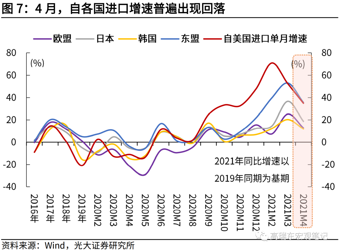 分国别来看,中国对各国出口增速均在回升,对美出口大幅反弹。以2019年为基数,4月中国对美出口增长34%(相对3月提升12个百分点,下同)。对日本、东盟出口大幅反弹,以2019年为基数,出口分别增长34%(+28个百分点)及49%(+25个百分点)。