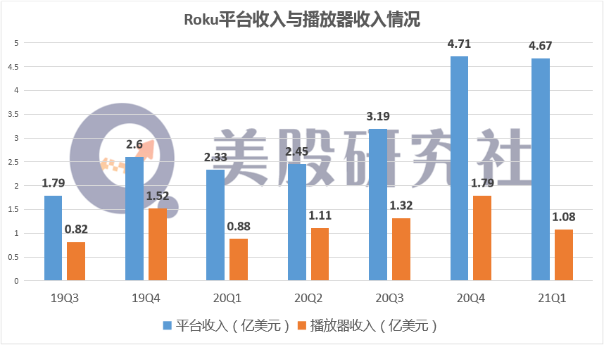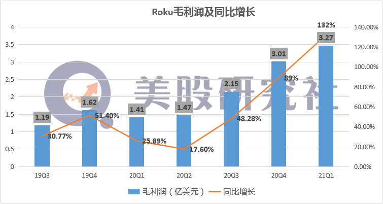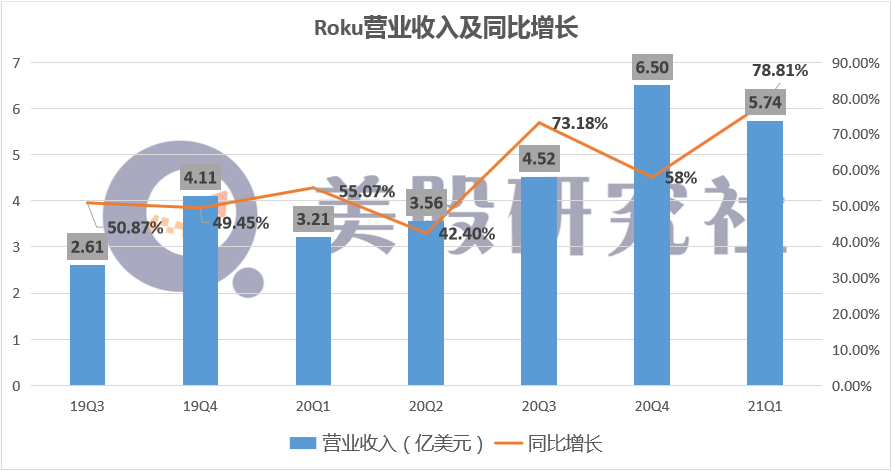 财报显示,Q1Roku实现营收5.74亿美元,超出市场预期的4.91亿美元,去年同期3.21亿美元,同比增长78.8%。